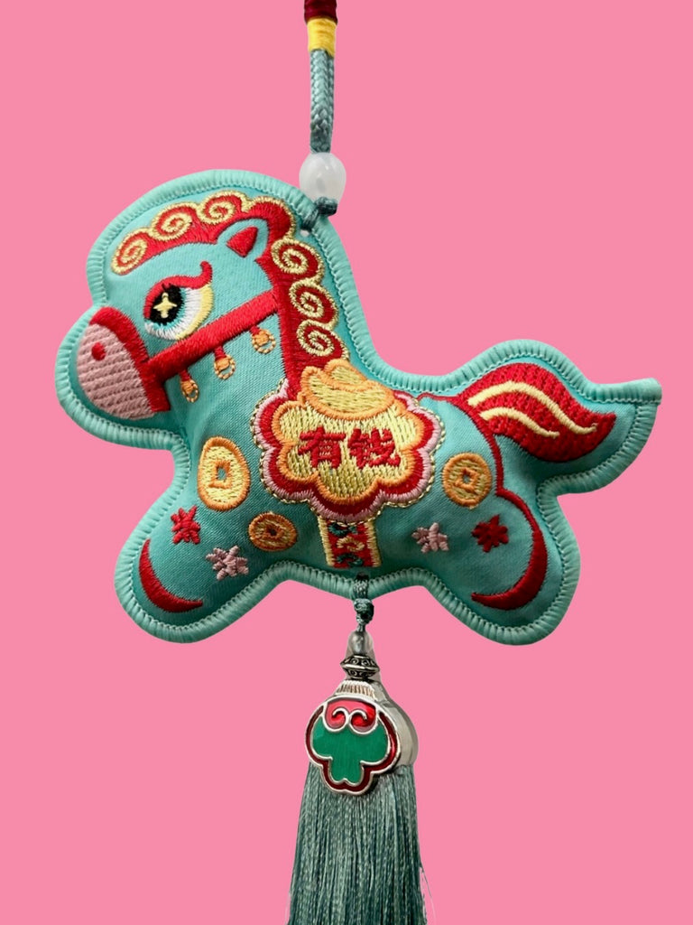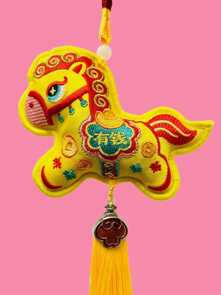 Ring in the 2026 Lunar New Year of the Fire Horse with this beautiful folk horse charm. Embroidered on each horse is the phrase 有錢 (yoǔqián, lit. to be rich), this charm brings blessings of riches. Horse charms feature a ornate fan shaped tassel bells as well as a cord for easy hanging from the straps of your backpack, purse, a doorknob, or your bed post. These adorable ornaments will surely bring joy...but hopefully also money!
