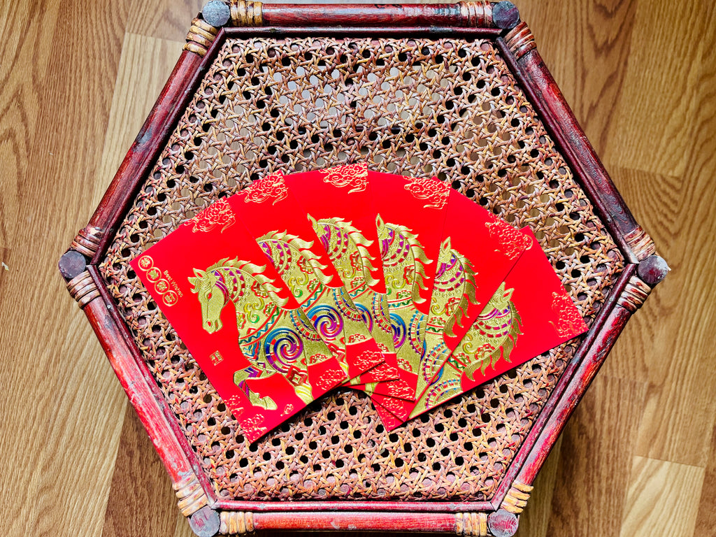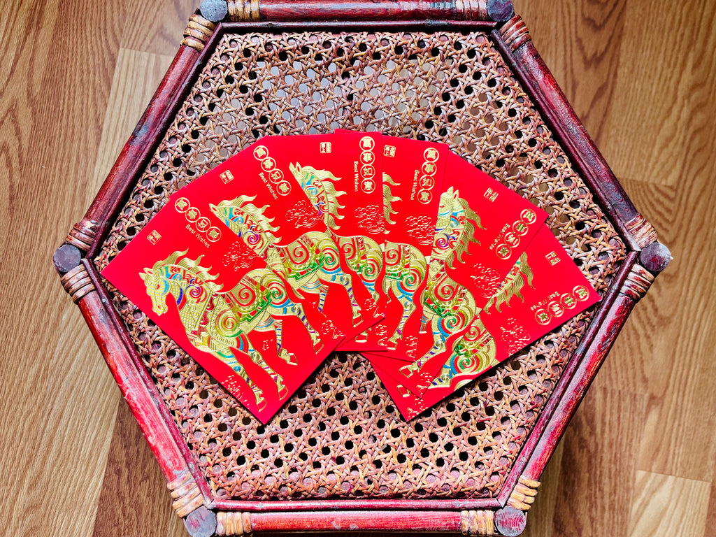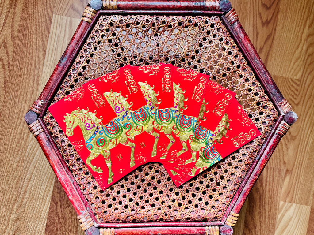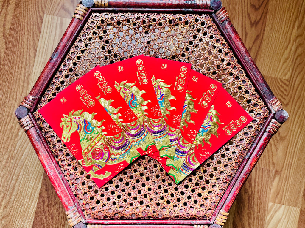 Embossed in gold with rainbow accents on premium red paper, these horse red envelopes will bring blessings and good fortune to the recipient. Each design features the illustration of a powerful yet composed horse, along with a blessing. Choose from the following designs: