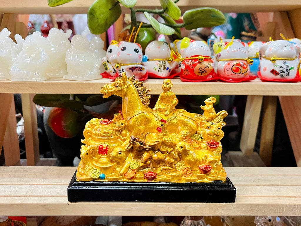 This highly-detailed figurine stars the horse to celebrate the Year of the Fire Horse, but also features all the other zodiac animals surrounding the horse to show harmony. It often serves as a fengshui item as the energies of all twelve zodiacs co-existing symbolizes balanced energies. It is placed around the house to usher in good luck and to represent every member of your household. This figurine is also seen as an all-around protector since having all twelve zodiac animals present means that the figurine will definitely include the lucky/protector animals of every household member, thus counterbalancing any bad luck that may come with the new year for a family member whose zodiac animal and element may clash with the Year of the Horse.